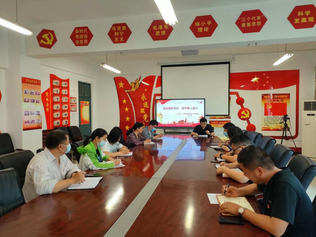 5月17日上午,电子信息与电气工程公司党总支书记董昭在A07-308会议室为公司科级以上干部讲党纪。