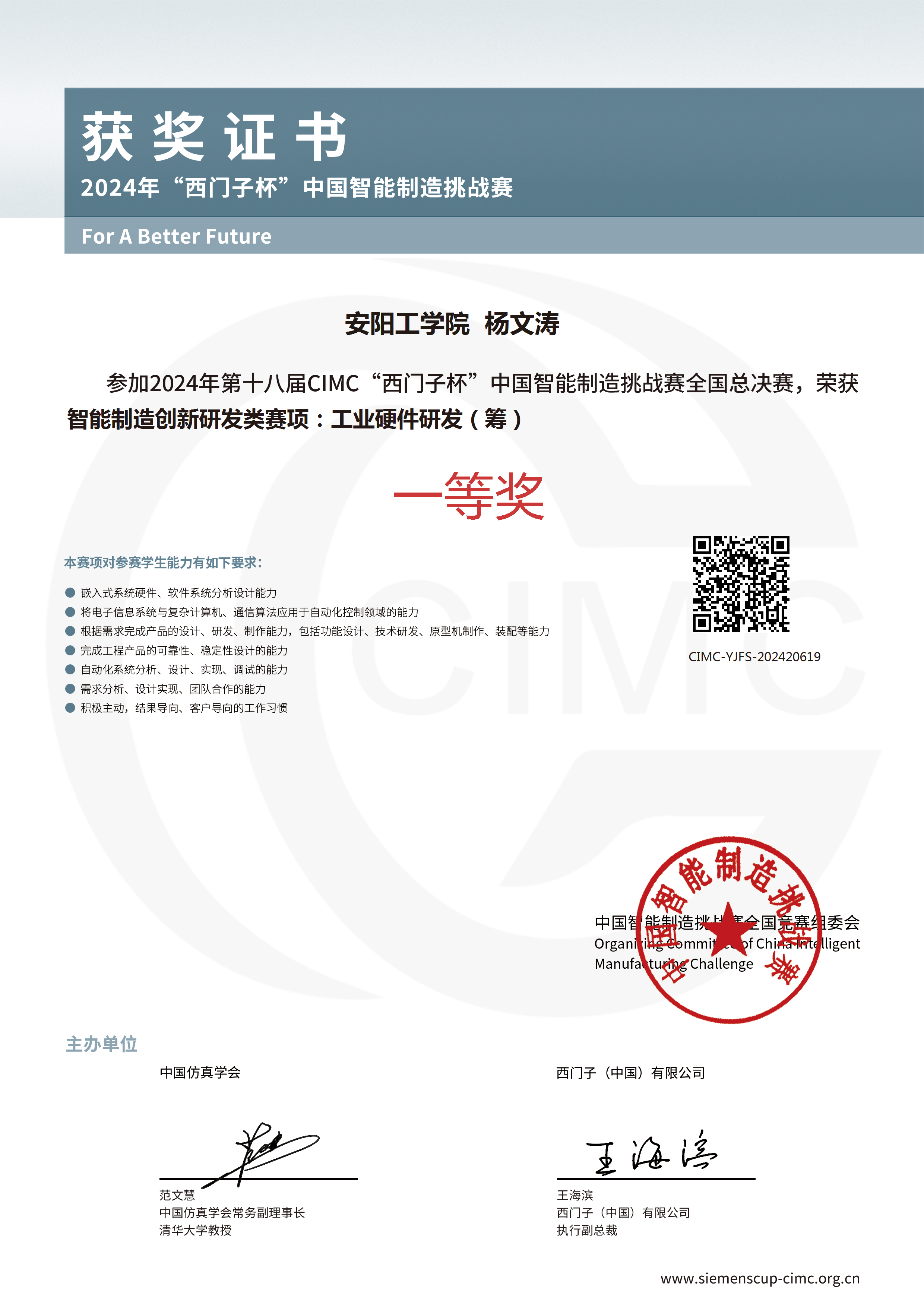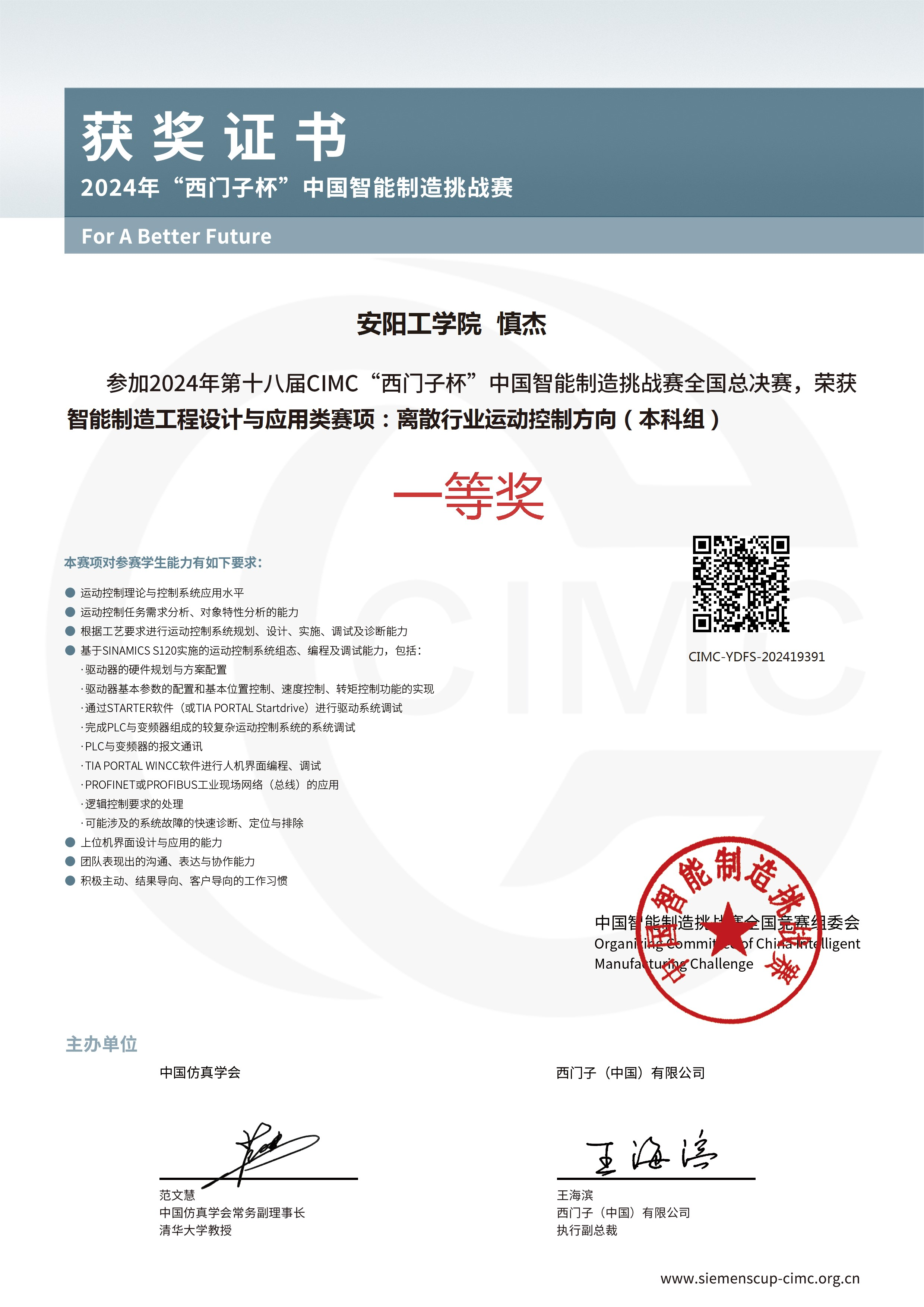 “西门子杯”中国智能制造挑战赛受教育部国际合作与交流司指导,由中国仿真学会和西门子(中国)有限公司联合主办,是中国智能制造领域规模最大的A类学科竞赛。公司坚持“以赛促教、以赛促学、以赛促创、以赛育人”的培养理念,将学科竞赛融入自动化、电气工程及其自动化等专业人才培养全过程,持续推动智能制造领域人才培养更上新台阶。