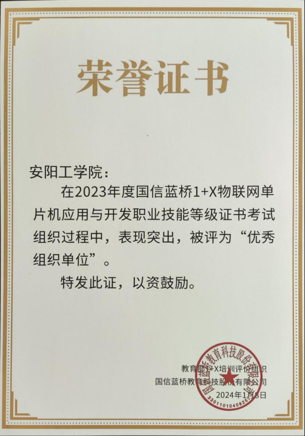 近日,公司被教育部1+X培训评价组织国信蓝桥教育科技股份有限公司评选为2023年度国信蓝桥“1+X”物联网单片机应用与开发职业技能等级证书“优秀组织单位”和“优胜公司”,公司高素玲老师和李小芹老师获得“优秀指导教师”称号。