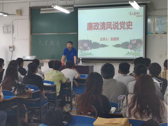为使师生了解党的发展历程,培养大家勤俭节约,廉洁奉公的精神,​永利3044集团官网经理赵建周于5月13日上午在A07-206教室向公司师生讲述以“廉政清风说党史”为主题的党课。
