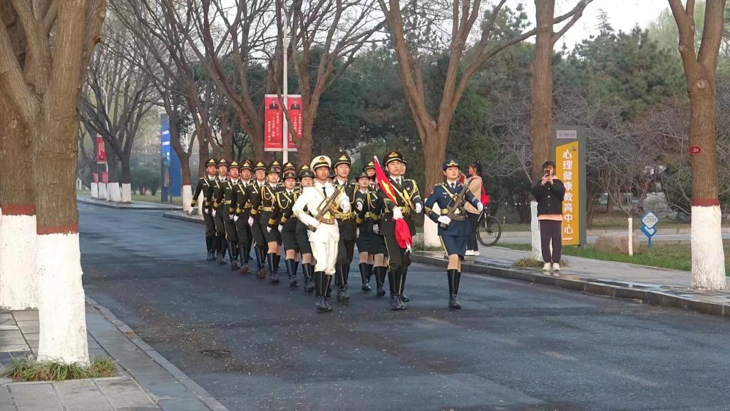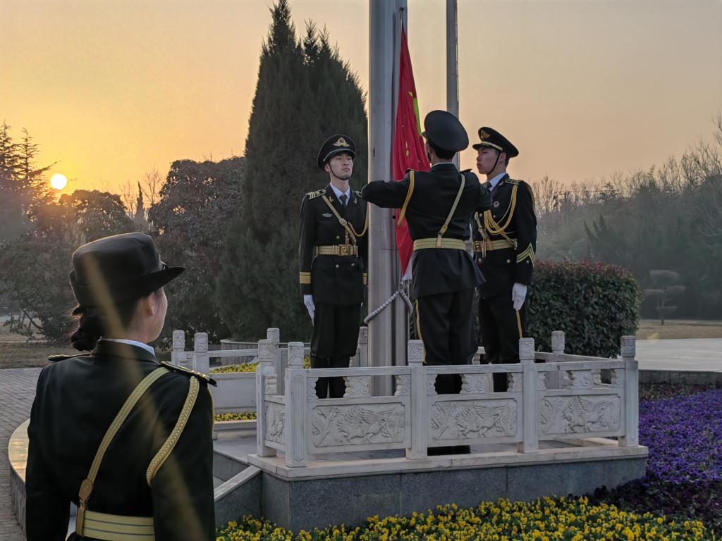 一阵清脆响亮的脚步声传来,国旗护卫队迈着整齐的步伐向升旗台缓缓前进,随着义勇军进行曲的响起,鲜艳的五星红旗在同学们的注视下缓缓升起,全体员工向国旗行注目礼。